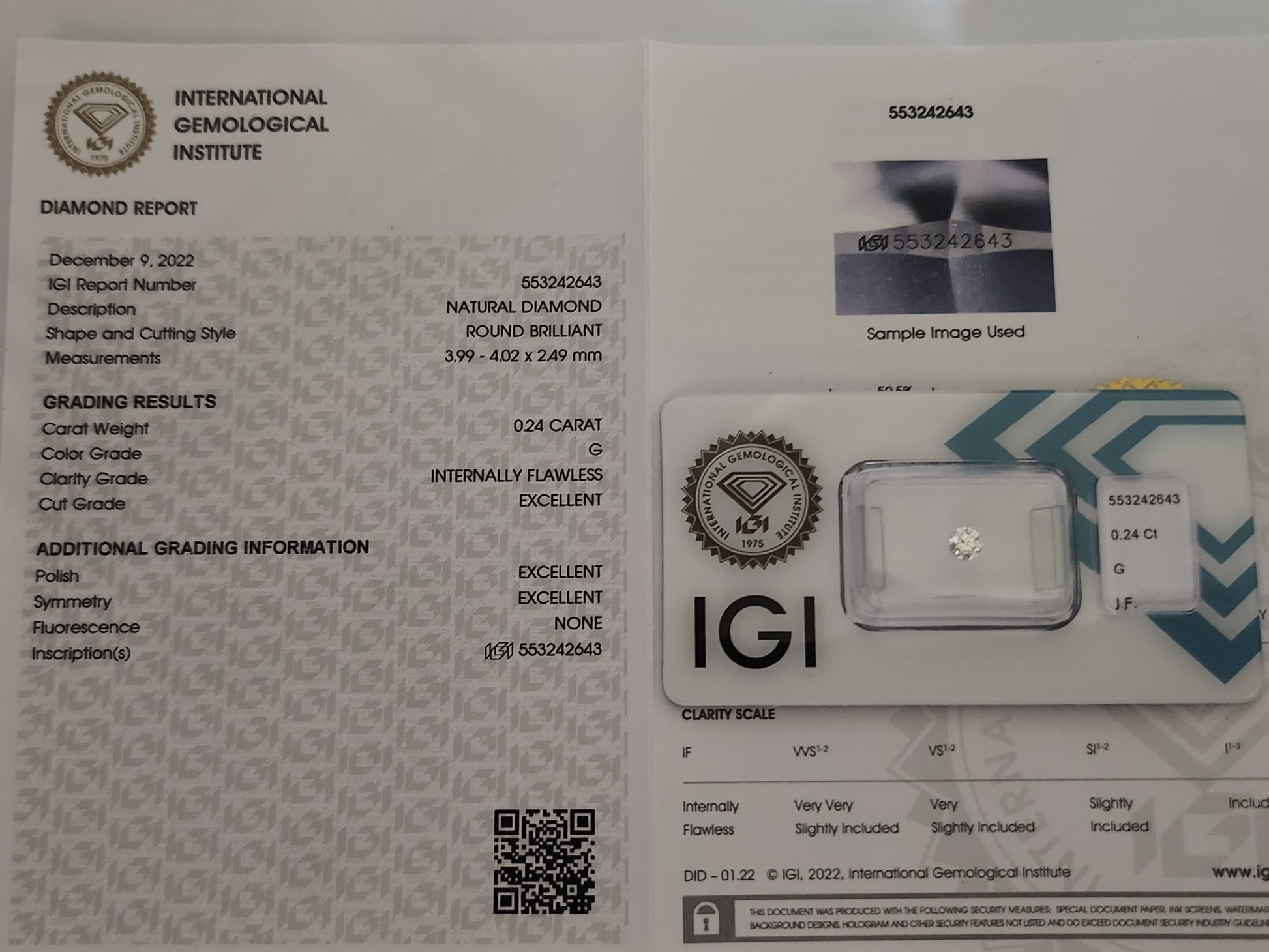 Come da titolo, vendo diamante blisterato caratura da 0.24, colore G, purezza IF , fluorescenza none, ex/ex/ex con certificato IGI.
